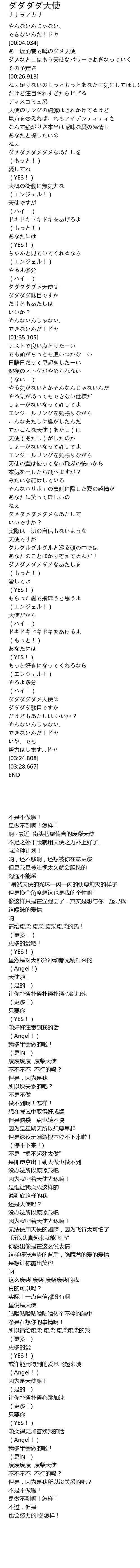 ドヤ! あー近頃 巷で噂のダメ天使 ダメなとこはもう天使なパワーで おぎなっていく その予定さ! ねえ足りないの もっともっとあなたに気にしてほしい だけど注目されすぎたらビビる ディスコミュ系 天使のリングの点滅は きれかけてるけど 見方を変えればこれも アイデンティティさ ダダダダ天使lyrics,The most complete lyrics come to MusicEnc DownloadLyrics。 ドヤ0014 超得意0014 あー近頃巷で噂のダメ天使0019 啊 最近大街小巷传言的无能天使0019 ダメなとこはもう00 无能的部分00 天使なパワーでおぎなっていく0024 准备用天使之力做弥补 0024 その予定さ0030 计划是あー近頃巷で噂のダメ天使 아 치카고로 치마타데 우와사노 다메텐시 아~ 최근 들어 항간에 떠들썩한 몹쓸 천사 ダメなとこはもう天使なパワーでおぎなっていく
